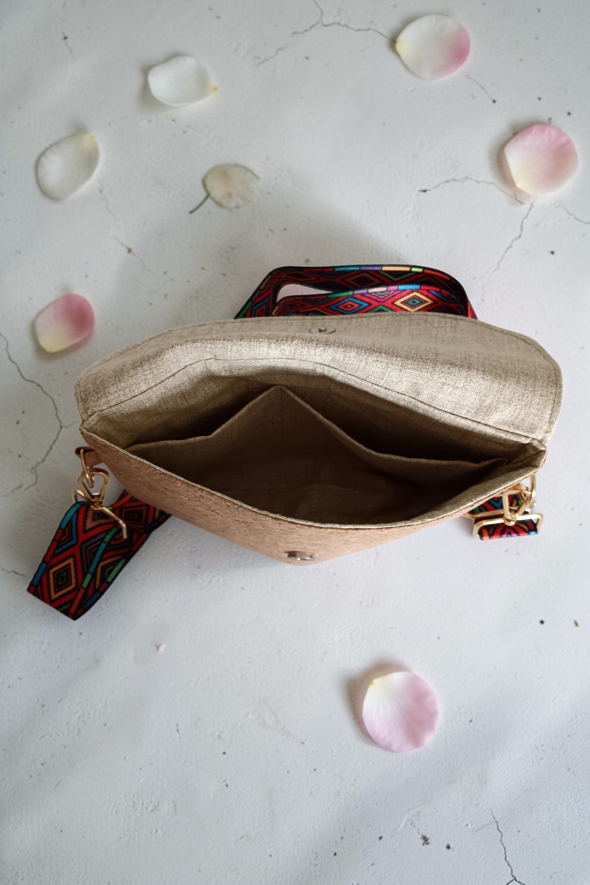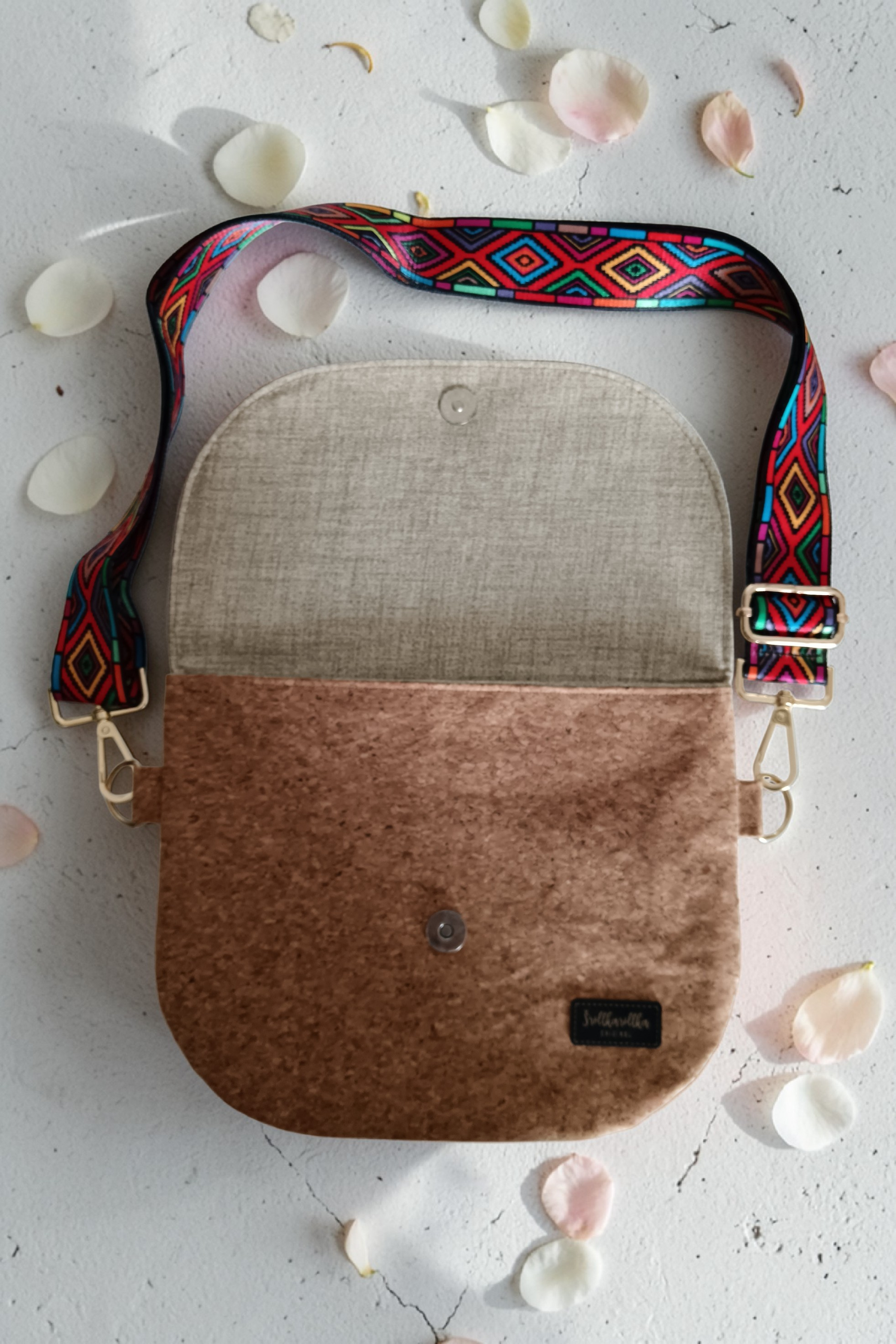 Hlavní část je ušitá z korku – lehkého, odolného a příjemného na dotek. Každý kus je jedinečný díky přirozené kresbě materiálu.