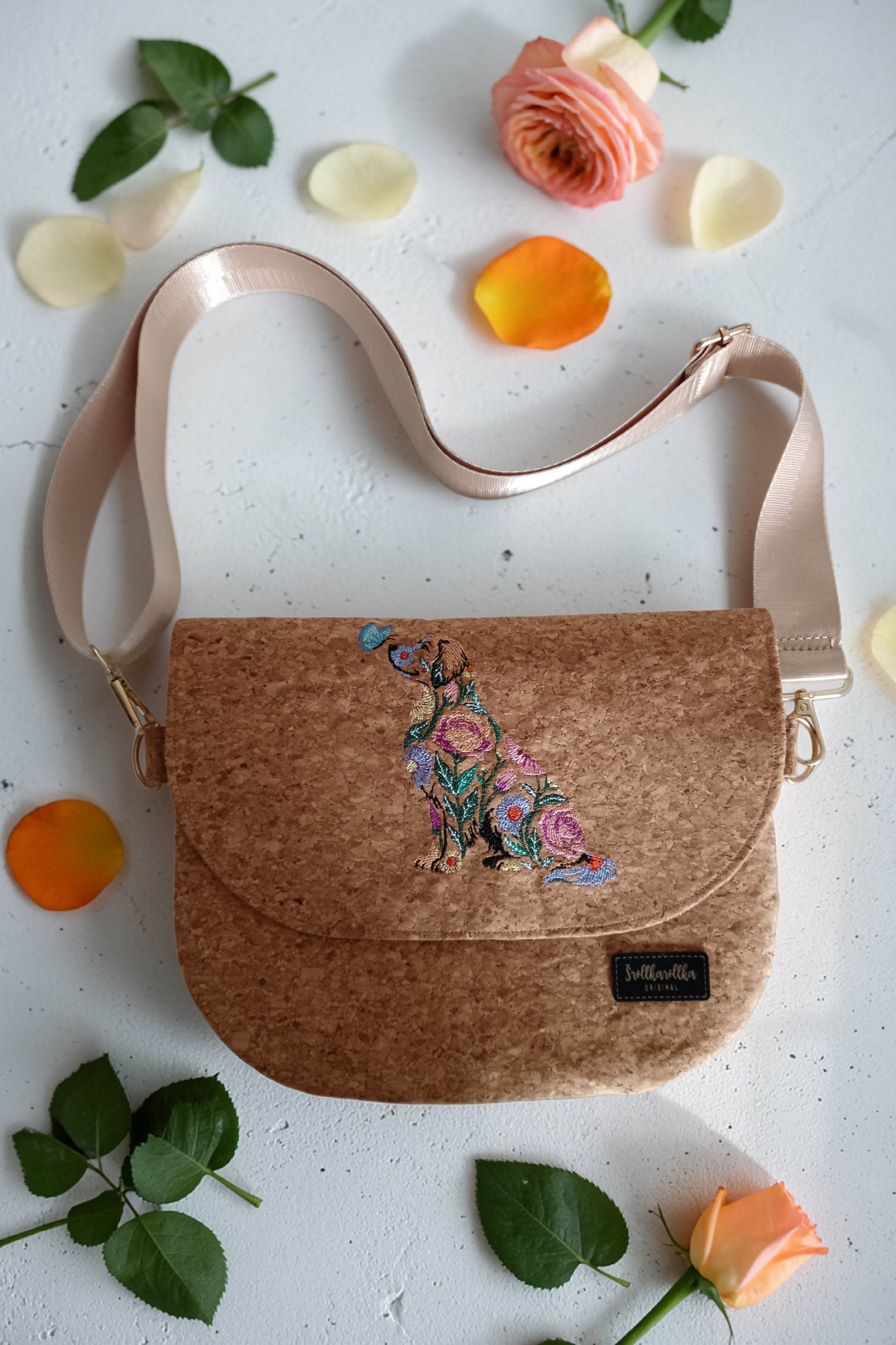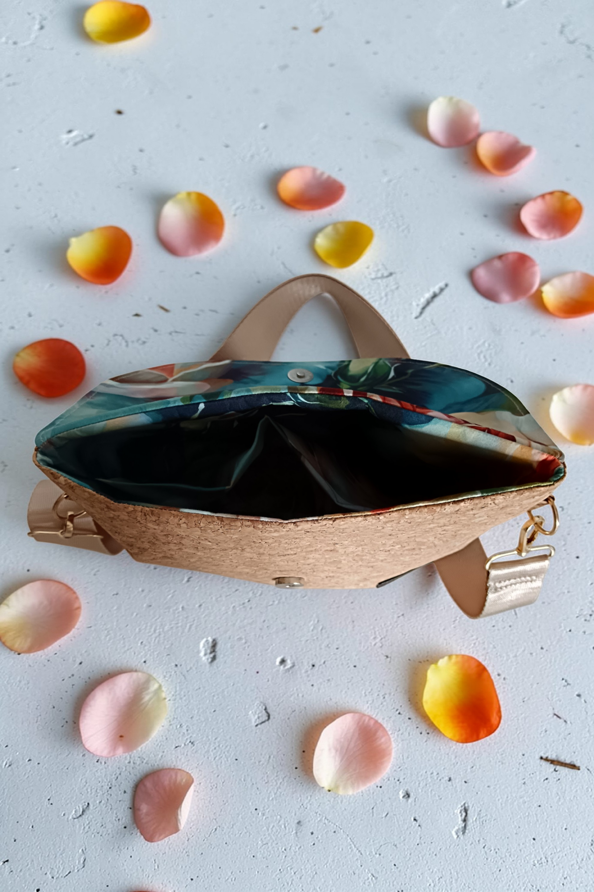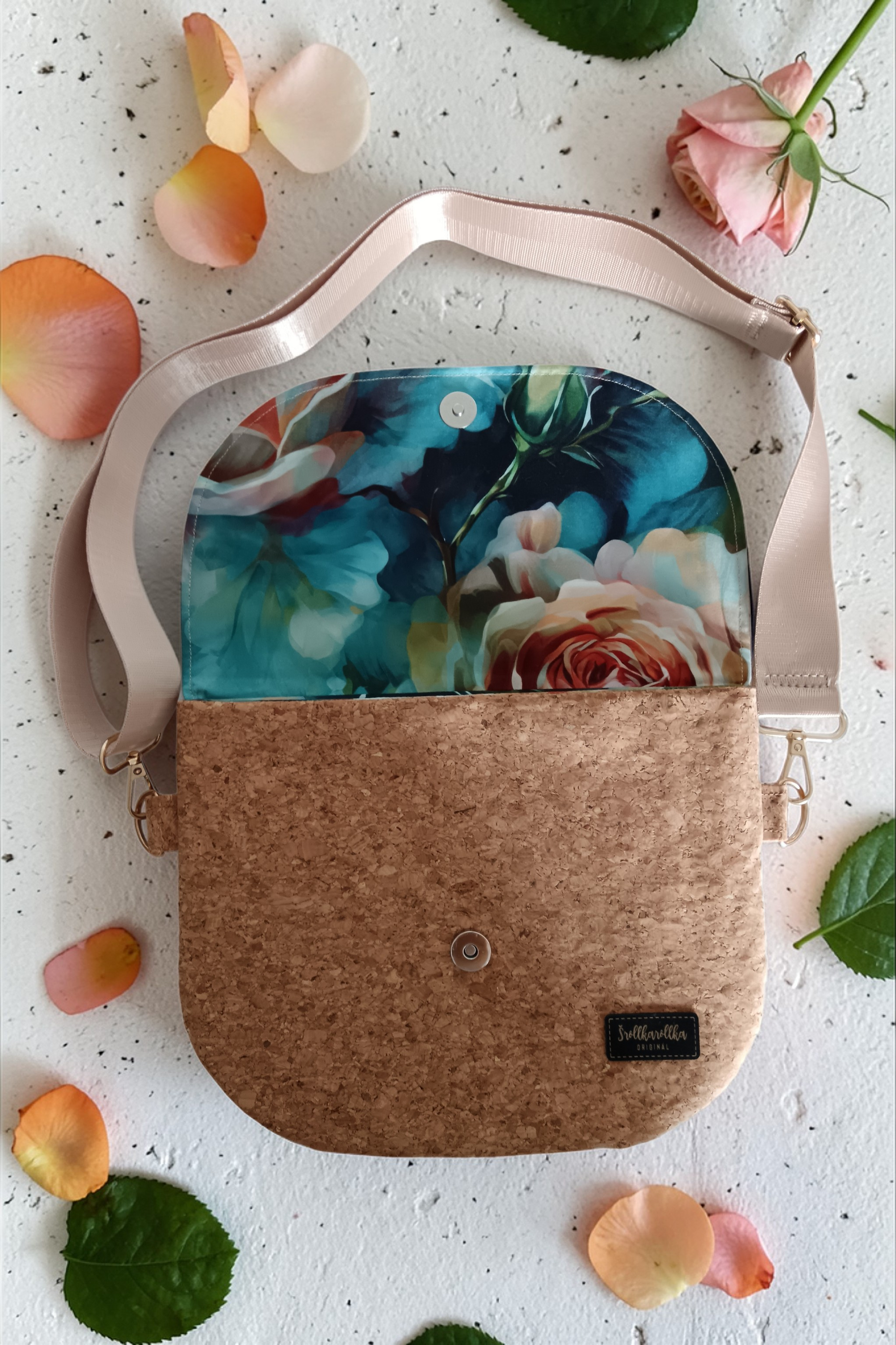Hlavní část je ušitá z korku – lehkého, odolného a příjemného na dotek. Každý kus je jedinečný díky přirozené kresbě materiálu.