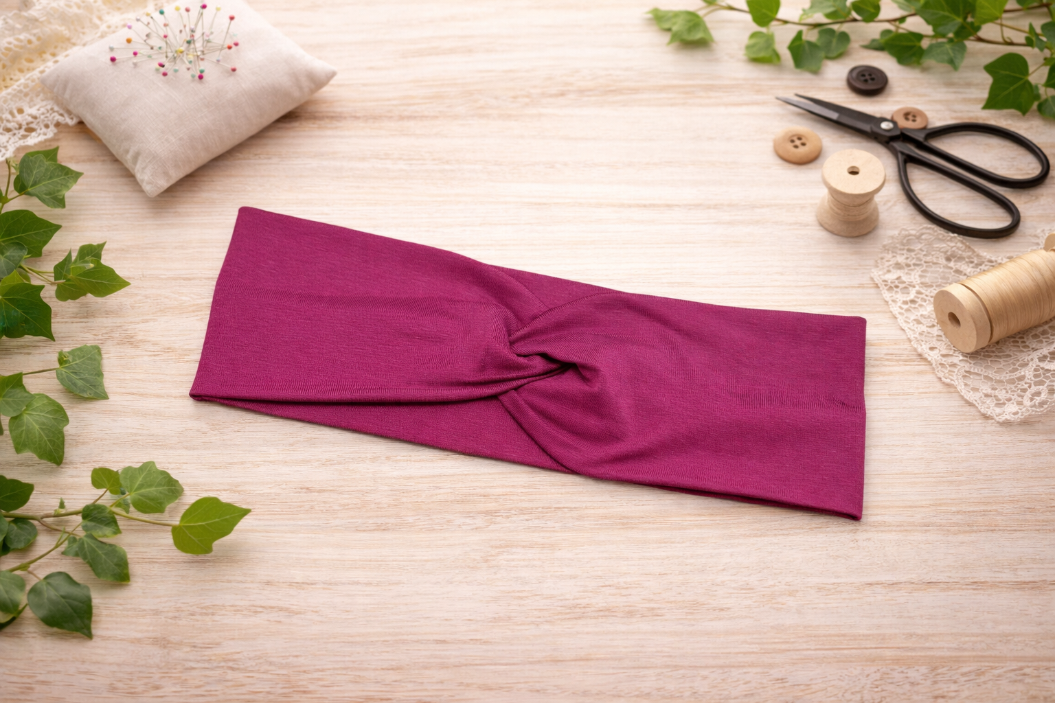 Ručně šitá křížená čelenka z elastického materiálu, pohodlné na nošení a zároveň stylový doplněk.