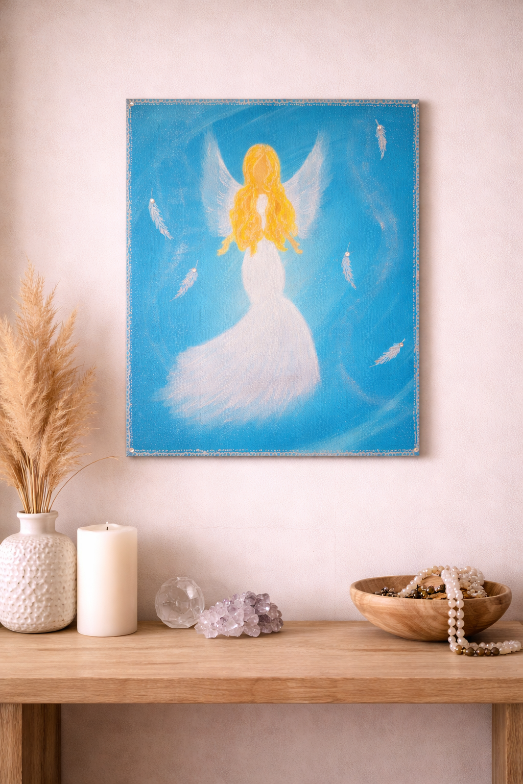 Obraz s motivem andělky a lehkého chmýří na růžovém podkladu se zlatým lemováním vybízí k zastavení, zasnění a tichému návratu do světa fantazie – klidně i uprostřed dne. Přináší pocit lehkosti, jemnosti a vnitřního klidu.