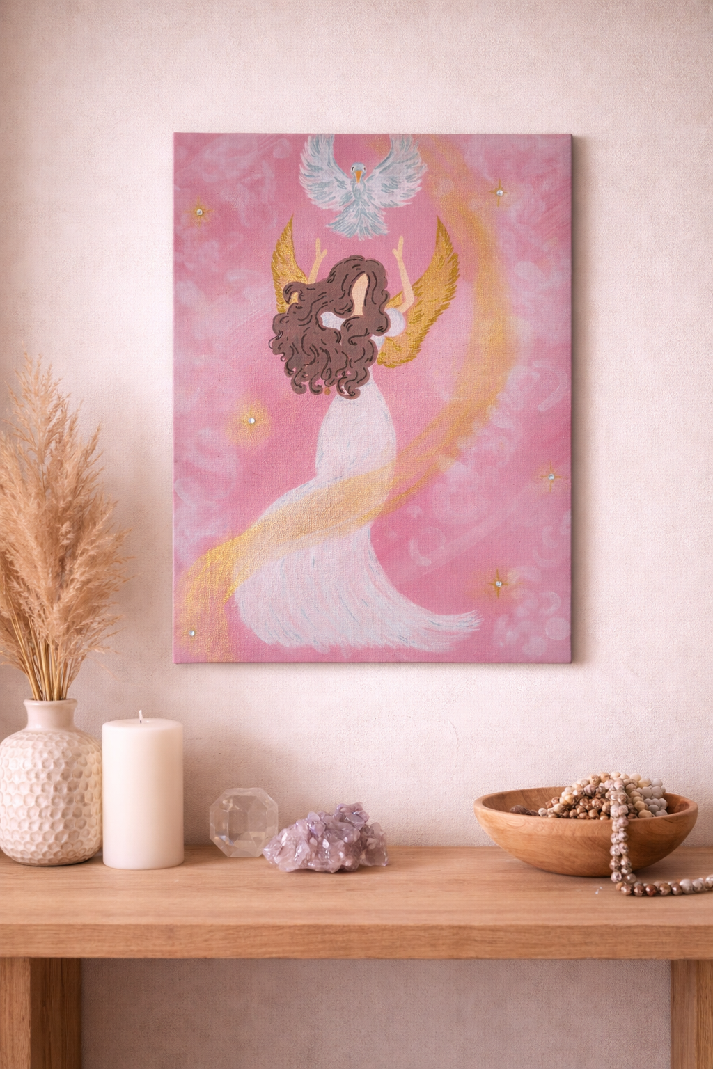 Obraz s motivem andělky a holubice na růžovém podkladu symbolizuje svobodu, lehkost a schopnost povznést se nad těžké životní zkoušky. Jemně připomíná, že i v náročných chvílích v sobě můžeme najít sílu rozepnout pomyslná křídla a letět dál.